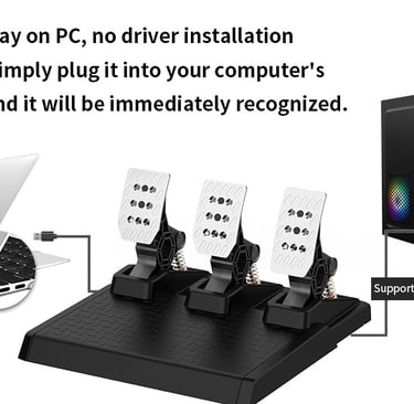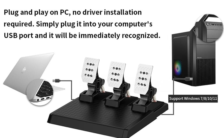 Designed for PC Gaming: Our USB steering wheel pedal set is compatible with Windows 11, Windows 10 and Windows 7 operating systems and provides a smooth and immersive racing experience for gamers. These gaming pedals work like plug-and-play controllers, perfect for sim racers building a personalized setup